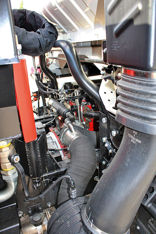 На прочной стальной раме установлен эффективный и экономичный турбодизельный двигатель Cummins B4.5 EV210. Это продукт совместного производства JAC-Cummins. В рабочем объёме 4,5 л он обладает мощностью 206 л. с. при 2300 об/мин и развивает максимальный крутящий момент 740 Нм при 1200-1800 об/мин. В смешанном режиме «город/шоссе» мотор потребляет 15 л ДТ на 100 км пробега. Возимый запас дизтоплива составляет 210 л в баке, установленном слева по ходу движения. В итоге автомобиль обеспечен приличной автономностью без заезда на АЗС для дозаправки, а это — комфорт и снижение времени рейса.