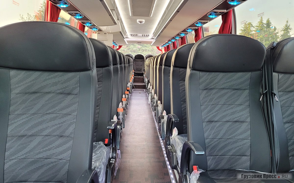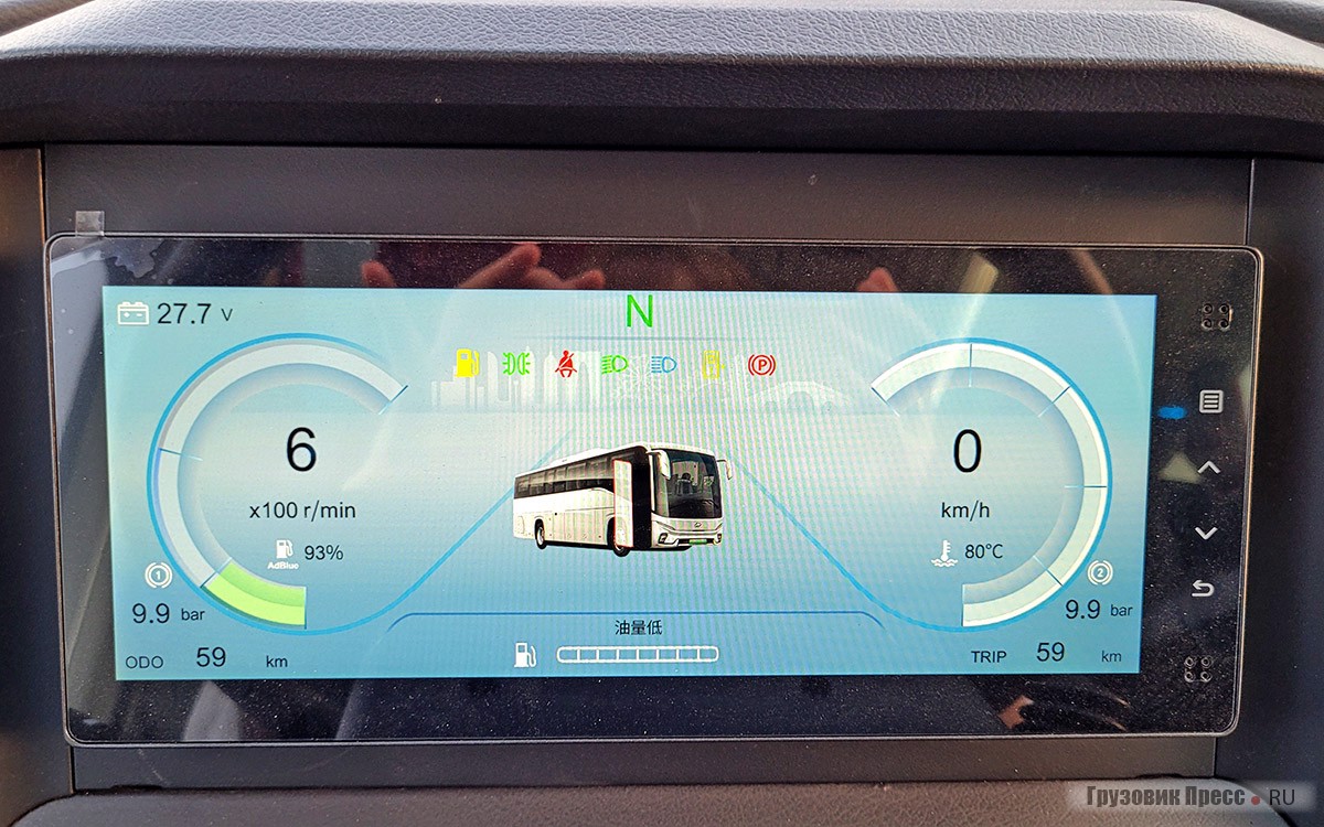 Современно и в соответствии с требованиями безопасности и нормативами эргономики выполнено рабочее место водителя. Здесь всё, как на витрине супермаркета, в удобных зонах и досягаемости вытянутой руки. Подрессоренное кресло выполнено с рельефной ягодичной и поясничной поддержкой и откидными подлокотниками с левой и правой стороны. Транспортным операторам лайнер доступен через официального эксклюзивного дистрибьютора Higer Bus в России – группу компаний «Русбизнесавто». Новшеством стал безступенчатый регулятор обдува ветрового стекла, которое теперь поставляется со встроенными нитями электрообогрева по всей поверхности. Добрых слов заслуживает организация рабочей зоны сидящего за рулём. Есть даже отдельный пятачок для зарядки мобильного телефона. Интерфейс планшетов на русском языке очень понятный. Всё это перевозчики обязательно оценят.