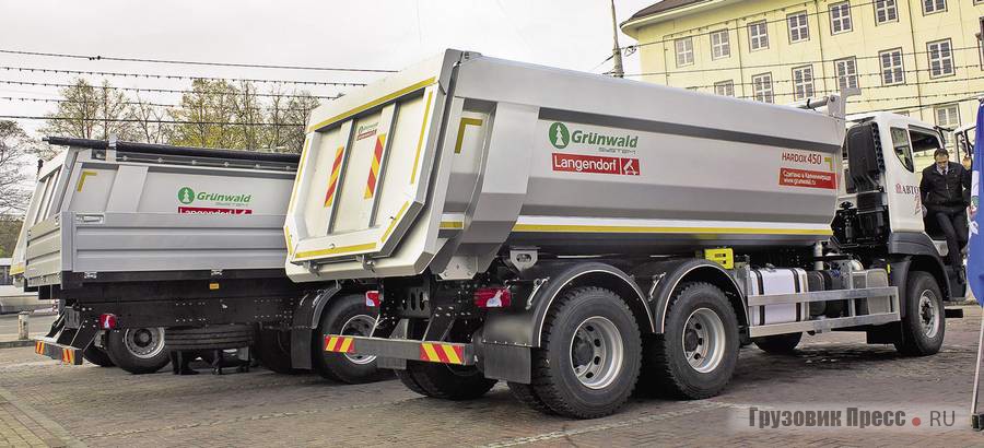 Разработку новой самосвальной надстройки конструкторское бюро «Grünwald» вело с использованием инженерного потенциала известного европейского производителя – компании Langendorf. Кузов надстройки выполнен по оригинальной технологии Half-pipe, позволяющей быстрее и безопаснее выгружать грузы высокой плотности, такие как сырой песок. Появлению и распространению этой конструкции способствовало усиление борьбы за эффективность перевозок – снижение собственной массы автомобиля, сокращение времени погрузочно-разгрузочных работ.
