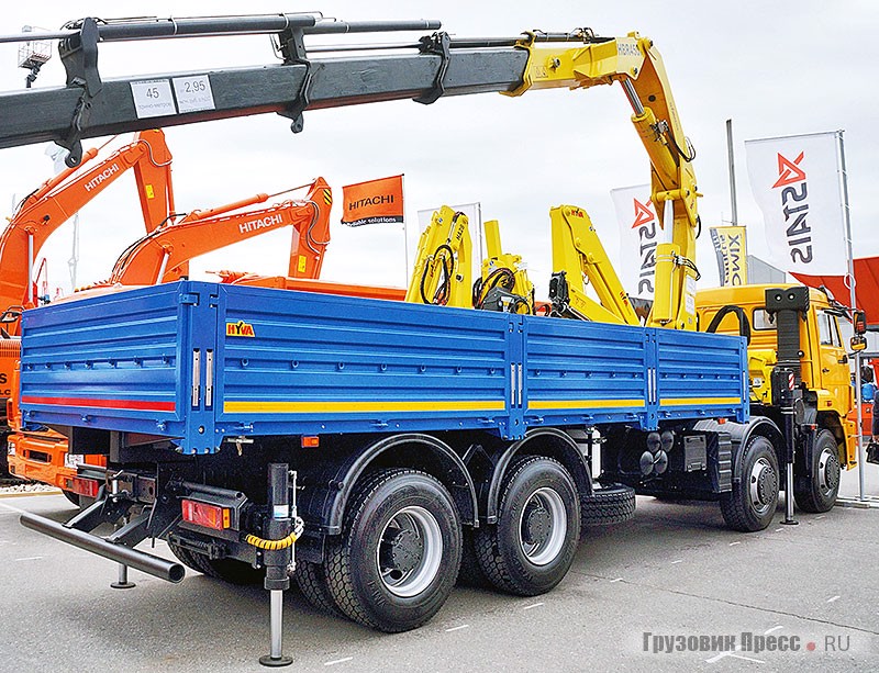 Из представленных на выставке автомобилей с КМУ хотелось бы выделить «Астейс-653427», смонтированный на шасси КАМАЗ-65207. Мощнейшая установка HYVA HBR450 развивает грузовой момент в 45,5 тм, позволяя раз на минимальном вылете (4,45 м) поднимать 10 300 кг, а на максимальном (11,5 м) – до 3550 кг. Бортовая платформа, рассчитанная на размещение 20-футового контейнера, и грузоподъёмность 21 100 кг делает автомобиль самодостаточной подвижной единицей.