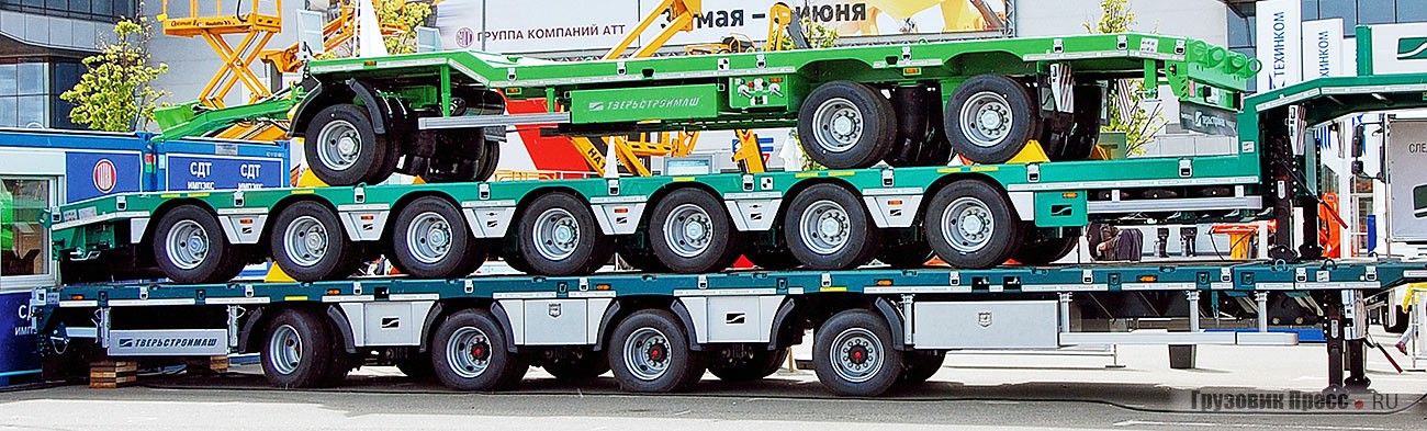 Тверские машиностроители не мудрствуя лукаво сэкономили на месте, представив сэндвич из трёх прицепов различной грузоподъёмности. Интересно, что сам завод «Тверьстроймаш», описывая стенд, делает упор, что они созданы в рамках концепции компании о прибыльных, безопасных и законных (выделено – Ю. П.) перевозках.