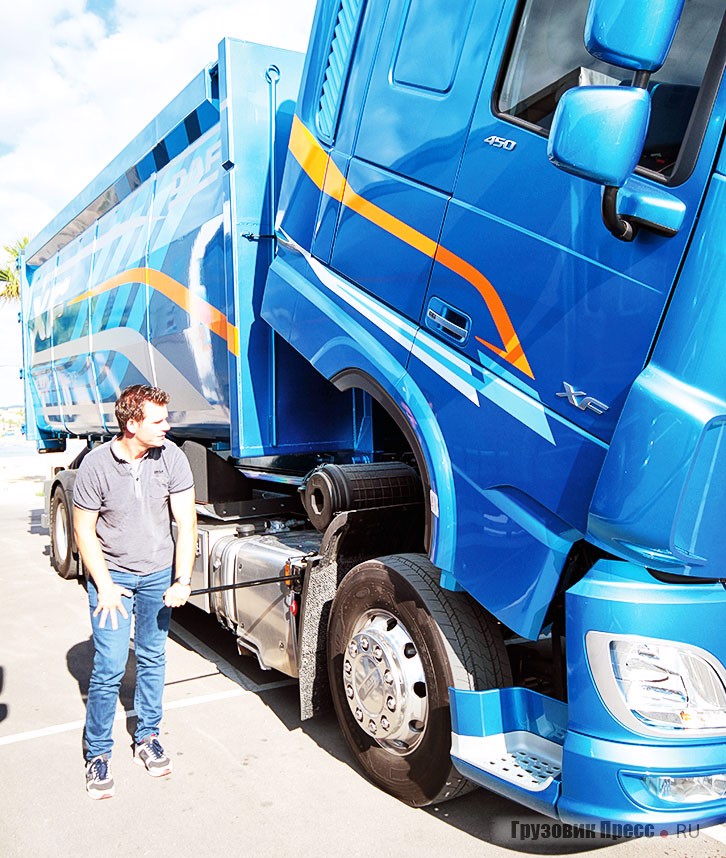 У нас принято сравнивать достижения с конкурентами. DAF в этом плане имеет некоторые инновации, безусловной из которых является борьба с шумом. Дело в том, что у компании появилась такая концепция, как вариант Silent – машина с уровнем шума всего 72 децибела. В своё время конструкторы сосредоточили своё внимание на этой теме, в результате в 2015 году появилась модель DAF CF370FT – это седельный тягач с колёсной формулой 4х2 и кабиной Sleeper Cab, т. е. низкой кабиной, но со спальным местом. Двигатель у него меньшей мощности, чем у других машин – MX-11 (370 л.с.), но и работает машина едва слышно, а при включении специального режима и вовсе бесшумно. Похоже, эта функция за два года распространилась на всю линейку грузовиков DAF. По крайней мере, я не слышал перекрывающего слух рычания тягача даже когда резво стартовал на сортиментовозе с 40 тоннами древесины за спиной.