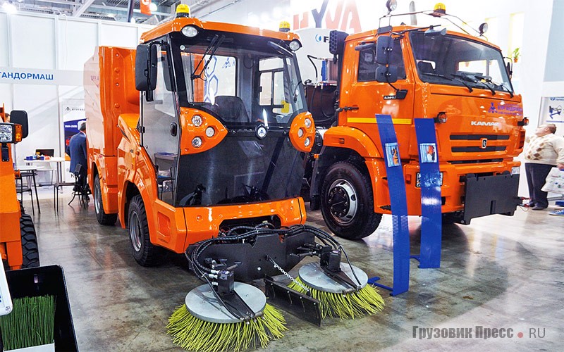 Новая разработка завода «Кургандормаш» представляет собой компактного городского дворника с шарнирно-сочленённой рамой. Длина малыша вместе с навесным оборудованием всего 5,75 м, ширина – 1,7 м. В зависимости от задачи на машину устанавливается подметально-уборочное, пескоразбрасывающее или поливочно-моечное оборудование. На выставке как раз был представлен первый вариант, с шириной захвата 2,5 м, бункером для смета вместимостью 2 м3 и водяным баком 0,23 м3.