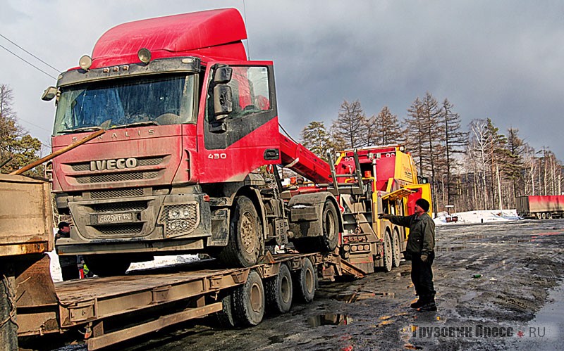 За аварийным седельным тягачом IVECO прибыл полуприцеп-трал. При погрузке тягач сошел одним колесом с платформы, и существовал риск его опрокидывания. Благодаря слаженной работе грузовой эвакуации «СпецБуксира» тягач был возвращен на платформу и правильно закреплён для последующей транспортировки к месту ремонта.