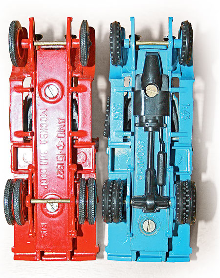 Все прекрасно знают, что АМО Ф-15 существовал в двух вариантах: раннем (с брезентовым тентом) и позднем (с деревянной крышей). «Элекон» и «Кзыл-Ту» выпускали копии «амошки» образца 1924 года, а вот масштабную модель АМО Ф-15 образца 1927 года выпускал Рославльский автоагрегатный завод ПО «ЗИЛ» из Смоленской области с 1987(?) года. Интересной особенностью этих «амошек» было то, что они (как бы в противовес алма-атинским) имели металлические кабину, борт, раму, диски колес и даже фары! Пластмассовыми (из полиэтилена) были только сиденье в кабине, ветровое стекло, клаксон и шины. Лишь спустя несколько лет модель была доработана, и у неё появились на днище имитация силового агрегата, карданная передача, задний мост и глушитель. Оба варианта различались и коробочками: у первого была глухая картонная, у второго – глянцевая с целлулоидным «окошком». Как ни странно, в производстве рославльский АМО при незначительных объемах выпуска продержался вплоть до 1995 года.