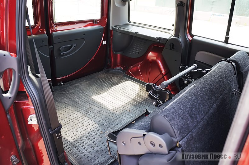 Планировка второй части салона близка к идеальной для коммерческого транспорта. Здесь нет ворсистой обивки и напольных ковров, собирающих пыль и грязь. Ровные стенки кузова дают возможность максимально компактно размещать коробки. Складывающийся по частям задний ряд сидений позволяет превращать пассажирскую версию в «комби». Справедливости ради отмечу, что создать идеально ровную поверхность не получится, да и сам диван в сложенном виде занимает довольно много места. К тому же одиночное кресло по левому борту при отсутствии двери слева становится ловушкой при сложенной спинке справа. Логичнее было поменять их местами, или… не жадничать и сразу заказывать 5-дверную версию.