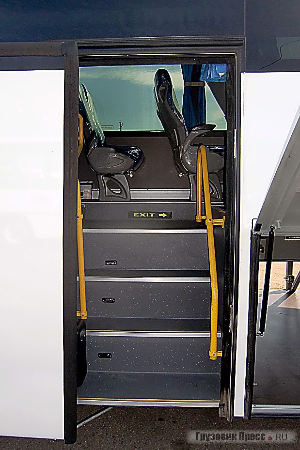 Интересным моментом, впрочем, характерным для всей линейки междугородных автобусов Higer, является функция автоматического закрывания дверей при трогании с места. Причём работает она только в случае, если автобус был поставлен на ручной тормоз – этакий своеобразный способ дисциплинировать водителя. Впрочем, постоянно пользоваться этой системой я бы не рекомендовал. И причина такой рекомендации проста – при отъезде от остановки, когда колеса повернуты влево, никаких проблем не предвидится, дверь не пострадает, даже если и не закроется автоматически. А вот при маневрировании по территории парка, либо при отъезде задним ходом от перрона вокзала, где порой сразу необходимо вывернуть руль максимально вправо, передняя створка может быть серьезно повреждена колесом.