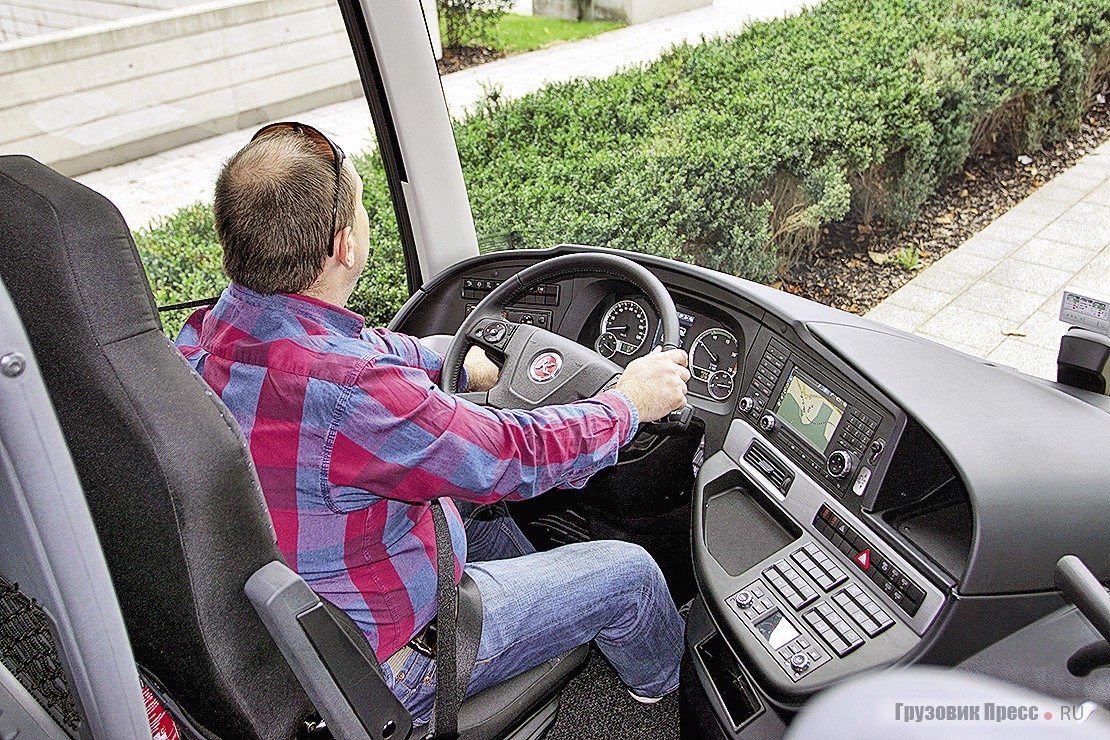Однако хватит брюзжать. Лучше похвалю 10-метровую машину за совсем небольшой радиус поворота, позволивший мне без проблем разъехаться со встречной фурой, невесть как оказавшийся в небольшой деревушке. Однако, когда наш маршрут переместился на автобан, я всё же опять обнаружил ещё одну ложку дёгтя. Автоматизированная КП переключается совсем неспешно, задумчиво, из-за чего даже с достойными «паспортными» показателями двигателя динамика автобуса весьма посредственная, и это особенно заметно, когда встраиваешься в транспортный поток с полосы разгона, покидая примыкающий выезд на автомагистраль. Предвидя позиции моих потенциальных оппонентов по этому вопросу, могу согласиться с тем, что такие настройки предусмотрены для того, чтобы избежать неприятных ощущений для элитных пассажиров и минимизировать уровень шума. Может быть, что и по этой же причине я отметил немного «пустой» руль в околонулевой зоне.