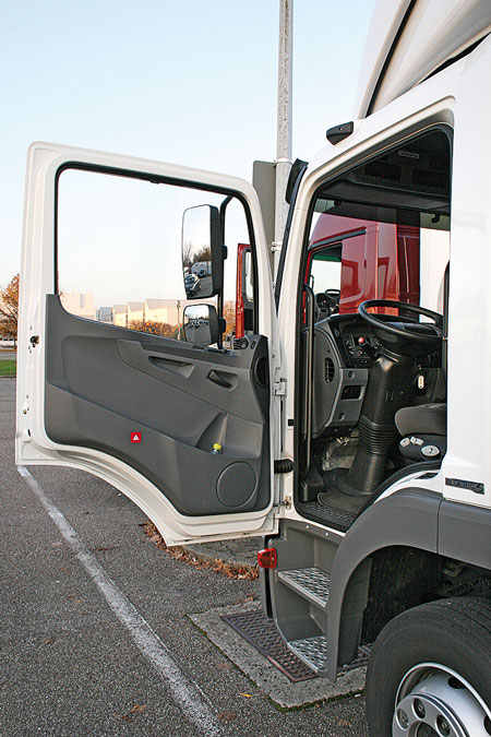 Достаточно одного взгляда на Atego, чтобы понять: это прирожденный городской извозчик, рассчитанный на ближнемагистральные броски. У него низкая кабина, шины небольшого размера, удобный вход и выход всего с одной незакрытой ступенькой. Высота пола над уровнем дороги – всего 818 мм. Рослый мужчина может взойти в кабину с легкостью кавалериста, впрыгивающего в стремя одним движением. Здесь и боковые поручни не так актуальны, как в более взрослых моделях: при необходимости можно взяться за руль. Но посадку и выход удобнее осуществлять по классической схеме – лицом в салон.
