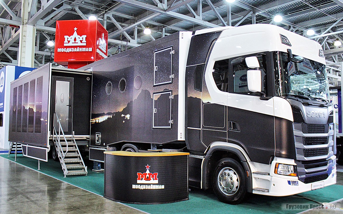 В желании застолбить себе центральное место компания «Мосдизайнмаш» на выставку снарядила целый автопоезд, который во время проведения выставки, стал мобильным офисом. Общая площадь трейлера вместе с раздвижными на 1,5 м полубоксами составляет 55 м2. Салон поделён на несколько блоков: офис, кабинет, кухня и санузел. Передвижной офис оборудован принудительной вентиляцией, автономным водоотводом, собственным водопроводом, а также генератором.