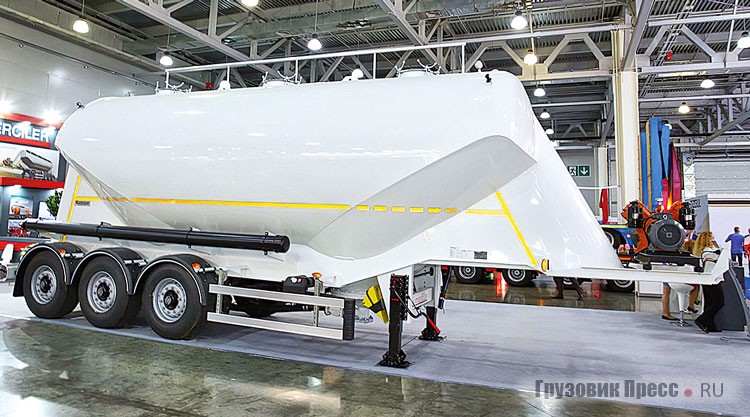 Турецкая компания Katmerciler из Измира уже успела засветится на выставках, благо присутствует на российском рынке с 2012 г. На выставке она показала материаловоз для перевозки цемента, минеральной муки и других сыпучих грузов. Всего компания выпускает материаловозы с объёмом цистерны от 28 до 60 м3. Сосуд выполнен из алюминиево-магниевого сплава 5186 толщиной 5,2 мм. Для увеличения прочности полуприцеп оборудован рамной конструкцией, отлитой целиком из алюминиевого сплава. В ходовой части используют осевые агрегаты как немецкие оси SAF или BPW, так и более интересные по цене турецкие. Полуприцепы изготовляют под заказ, срок исполнения – 35 рабочих дней.