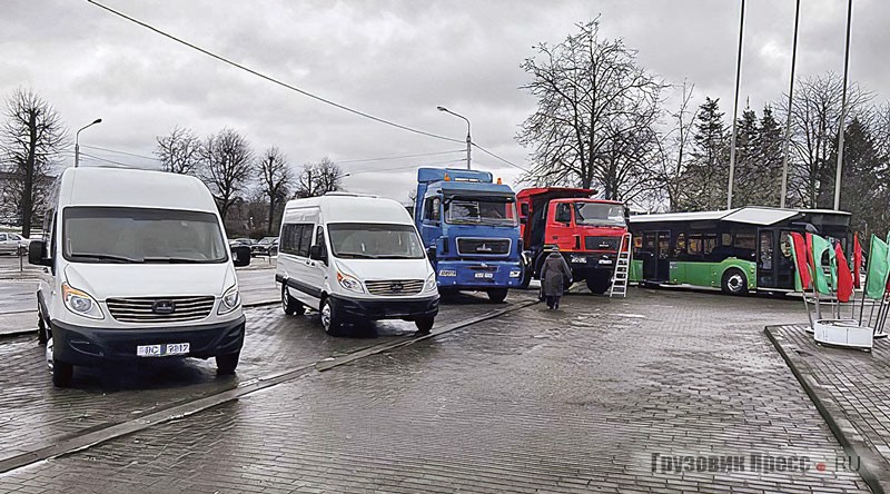 При выходе участники конференции наконец смогли отдохнуть на созерцании центральной экспозиции. Перспективную часть завода открывали изумрудно-зелёный автобус МАЗ-303 и лазурный магистральный тягач МАЗ-54А02К, которые уже показали прошлым летом. Другие экспонаты демонстрировались впервые.