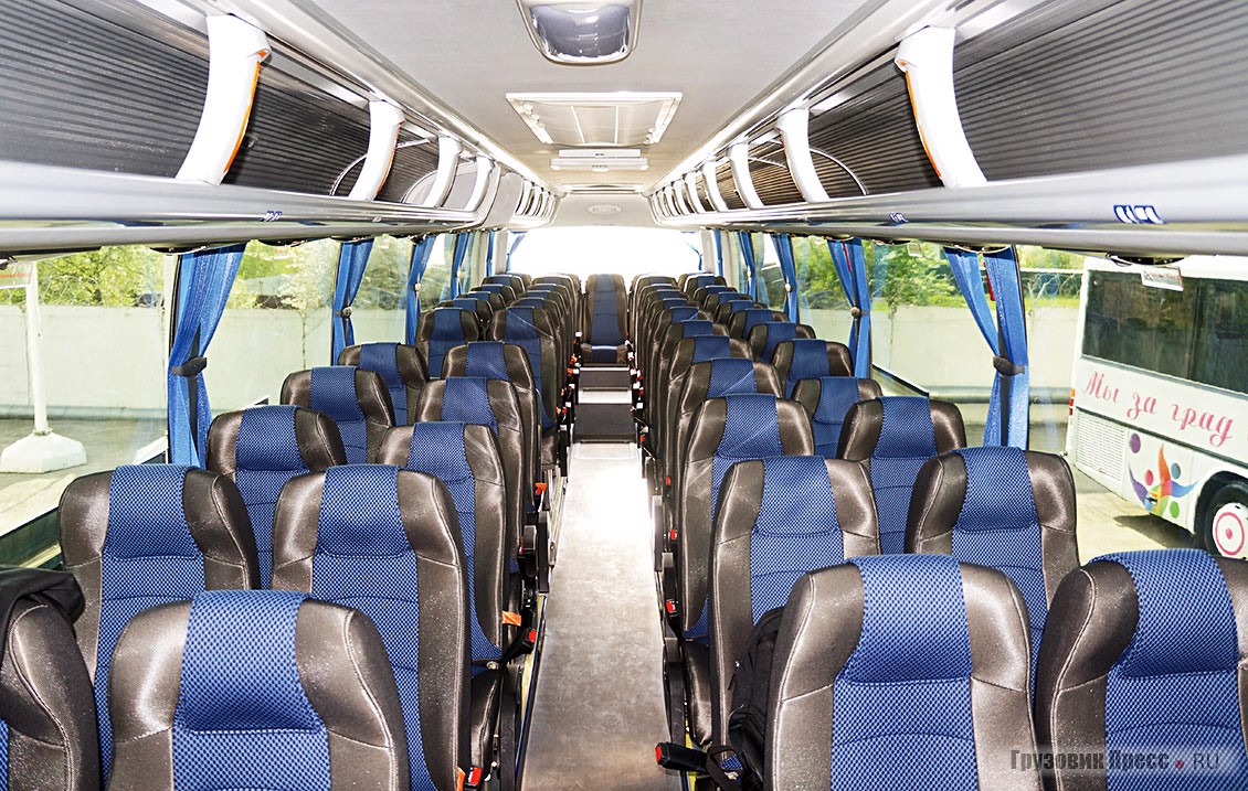 Внутри всё стандартно – четырёхрядная планировка, со всей положенной атрибутикой в виде откидных спинок, складных подлокотников и двухточечных ремней безопасности. Впрочем, на фото вы видите, скорее, версию салона «бюджет», ибо откидные столики на спинках отсутствуют, а кресла занимают всё возможное пространство салона. Зато при желании сразу за 2-й дверью можно установить кулер для воды или полноценный холодильник, а перед ней на своё «традиционное» место прекрасно встаёт санузел. Причём, если раньше надо было выбирать или «WC», или «спальник», то теперь это два независимых друг от друга элемента, которые можно заказать в любой вариации. Кстати, в спальном отсеке предусмотрены как кондиционер, так и отопитель. Разумеется, при этом снизится общая пассажировместимость: кулер/ холодильник – минус два места, санузел – минус 2 места. Соответственно снижается и вместимость багажного отсека – за всё нужно платить. Благо, вместимость багажника позволяет не экономить на опционных модулях.