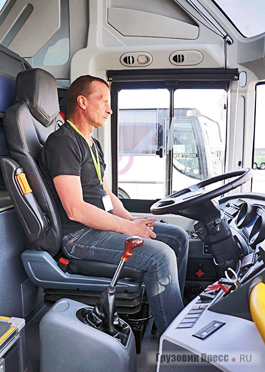Всё это неправда! То есть правда, конечно, но на работе это никак не сказывается. Скажу больше, рабочее место в целом мне понравилось гораздо больше, чем в других моделях Higer. Оно стало просторнее и, пожалуй, комфортнее. Что же касается первого впечатления, то к дизайнерским изыскам интерьера я в целом равнодушен, кнопки, скорее всего, на последующих экземплярах опять приобретут благородный чёрный цвет, а никаких бликов даже при ярчайшем весеннем солнце на стекле так и не появилось. Единственный нюанс: когда я стал включать задний ход, рычаг КП неожиданно упёрся в откинутый правый подлокотник кресла. «Ага! – воскликнул я. – Не обошлось, пусть и без мелкого, но всё же недостатка!» Увы, оказалось это особенности моей посадки – тут же севший на моё место водитель-перегонщик Алексей (он примерно моего роста), настроив кресло под свои параметры, включал заднюю передачу без проблем. Впрочем, автобус с точки зрения водителя понравился, значит не «увы», а «класс!».