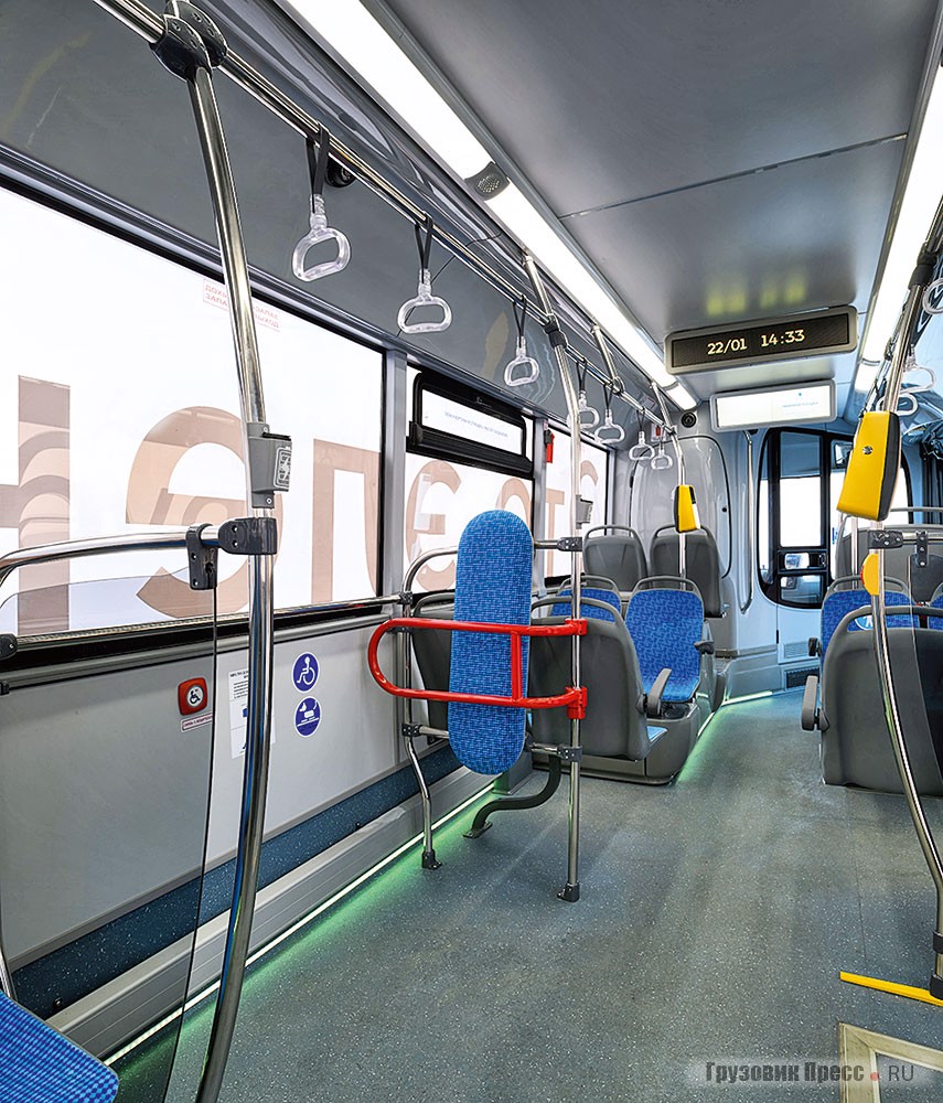 Этот привычный с виду почти заурядный внешне низкопольный автобус, чуть подросший вверх, на автономной электротяге относится к большому классу и вмещает 100 пассажиров, включая 30 посадочных мест. Пассажирские кресла выполнены из прочного пластика с тканевым покрытием. Для удобства пассажиров предусмотрены поручни различной конфигурации и перемещаемые ручки, имеются и USB-розетки с несколькими портами, где можно подзарядить телефон или другой гаджет. В корме больше нет моторной шахты, там стало светлее и просторнее.