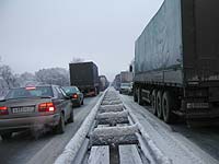 В половине девятого встречный водитель передает по радио: «Всем кто на Питер: между Трубняковым Бором и Помераньем – пробка. Легшая на бок «фура» перекрыла дорогу в двух направлениях. Проезжим остался только крайний правый ряд на Москву»… Виктор констатирует, что «это как минимум на 2-3 часа», и, как впоследствии выяснилось, оказался прав. Я выхожу на дорогу, и едва удерживаюсь на ногах, под ними сплошной лед! В это время между водителями «вставших» автомобилей разыгрывается театрализованное действо по радиосвязи. «Да здравствуют питерские коммунальщики и работа с девяти до шести! Они спят – мы стоим. И нет, чтобы посыпать дороги заранее! Зажрались! Новгородские дорожники – нищие, у разбитого корыта, но и то работают, а не спят до обеда».