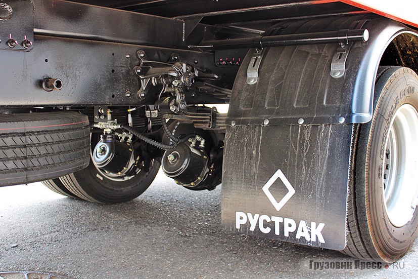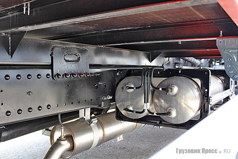 Мосты JAC N120X крепятся к раме с помощью полуэллиптических рессор. Ведущий мост держит нагрузку в 9000 кг, хотя реально она меньше. Для ряда транспортных задач предпочтительнее пневмоподвеска. В данный момент шасси с заводской пневмоподвекой находится на сертификации для российского рынка, и скоро будет доступно для заказа покупателями. Комплект с пневмобаллонами для изменения погрузочной высоты можно установить сейчас на штатную рессорную подвеску, конструкция это позволяет. При этом вносить изменения в ПТС автомобиля не потребуется.
