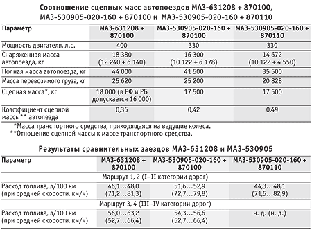 В процессе доводки опытных образцов МАЗ-530905 минчане провели несколько сравнительных испытаний. В качестве одного из оппонентов новым машинам был взят трехосный МАЗ-631208 с колесной формулой 6х4 в составе автопоезда с прицепом МАЗ-870100. С противоположной стороны фигурировал "двускатник" в сцепке с тем же 870100. Однако для полноты картины его "прокатали" и с 870110. Весовые параметры автопоездов, как видно из таблицы, похожи.