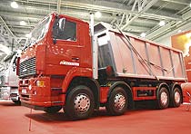 Заметный экспонат в экспозиции МАЗ – самосвал с колесной формулой 8х4 полной массой 41 т и объемом платформы 21 м3 для перевозки сыпучих грузов по дорогам общего пользования с допустимой нагрузкой на заднюю тележку 18 т, а также для технологических и ведомственных дорог с допустимой нагрузкой 26 т. Выставочный образец автосамосвала способен перевозить 25 т груза, а в дальнейшем его грузоподъемность будет повышена до 32–33 т. При этом будут применены усиленные передние оси с допустимой нагрузкой 9 т и так называемый «658-й» двигатель ЯМЗ – новая V-образная «восьмерка» стандарта Euro 3. Автомобиль с кабиной нового поколения 8х4 открывает перспективный класс грузовиков МАЗ, в котором будут как самосвалы, так и шасси под установку надстроек заказчика: автокранов, бетоносмесителей, автоцистерн. Цена выставочного экземпляра с учетом НДС составляет 2,262 млн. руб., однако при заказе техники потребителями она может измениться.