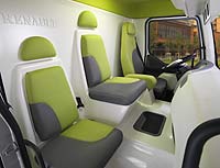 Например, при открывании двери нижняя ступенька выдвигается, облегчая тем самым посадку и выход из кабины. Внутри тебя не покидает ощущение прикосновения к будущему. Все имеющееся на борту оборудование создано не ради бутафории: оно адаптировано к основному виду деятельности данного транспортного средства – сбору отходов. Сочетание в интерьере цвета слоновой кости и мягкого зеленого света создают в кабине уют, а успокаивающий свет делает внутреннее пространство более внушительным.