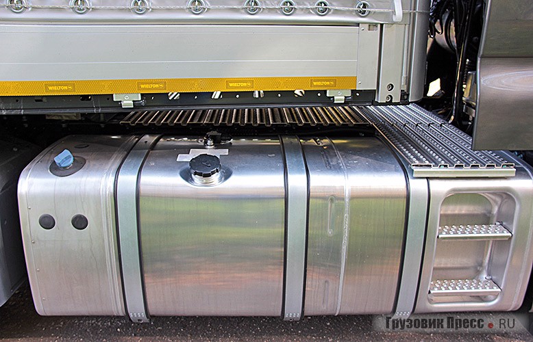 К материалам и исполнению не придерёшься, в высоченной кабине конечно же нашлось достаточно места для всевозможных ящичков, ниш и полок для вещей. Вообще, было бы странно здесь споткнуться о какой-нибудь явный косяк. Даже гнёзда прикуривателя и электропитания (одно из водительских замечаний) теперь присутствуют в достаточном количестве на 12 и 24 В. За кабиной широкая рабочая площадка позволяет удобно работать со сцепной станцией и другим оборудованием. Два топливных бака на 760 и 580 л и ёмкость для AdBlue на 100 л позволят нечасто беспокоиться о наличии АЗС.