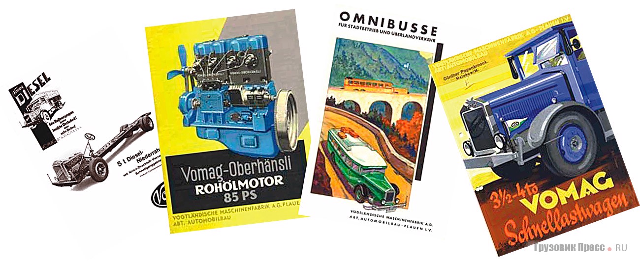 В 1932 г. фирма Vomag построила экспериментальный 4-осный грузовик с колесной формулой 8х2/4, где подкатную поворотную ось разместили перед задней тележкой. Автомобили Vomag 1930-х годов выпускали в самых различных модификациях: бортовые платформы, седельные и балластные тягачи, самосвалы, фургоны и шасси для установки специальных кузовов, в том числе коммунальные машины, автобусы. В 1936 г. был выпущен «скорый» балластный тягач (Eilschlepper), способный буксировать три прицепа. Характерными особенностями моделей являлись КП с ускоряющей передачей и привод всех колесных тормозов системы Knorr с пневматическим усилителем. В 1938 г. в программе фирмы появились 6-цилиндровые дизельные двигатели мощностью 150 л.с., через год фирма стала применять и 160-сильные моторы в комбинации с 8-ступенчатой КП. В 1940 г. Vomag разработал программу унификации всех моделей и начал изготовление армейских машин. Гражданскую гамму представляли только два грузовика грузоподъемностью 3,0–4,5 т с бензиновыми двигателями в 75–90 л.с. или компактной газогенераторной установкой, размещенной в отсеке за кабиной и работавшей на древесных чурках. С 1942 г. фирма стала называться Vomag Vogtländische Maschinenfabrik AG, тогда же она прекратила выпуск грузовиков и до весны 1945 г. изготовляла для вермахта самоходные артиллерийские бронированные установки на гусеничном шасси – истребители танков Jagdpanzer IV и 18-тонные полугусеничные тягачи по лицензии фирмы FAMO. В это время на заводе в Плауэне работали сотни военнопленных, в основном из Польши, Югославии и СССР. В сентябре 1944 г. английская и американская авиация совершила первый массивный налет на Плауэн. В марте 1945 г. бомбардировки города возобновились, однако союзные бомбы причинили заводу Vomag мало вреда, большая часть станков и машин уцелела. 16 апреля 1945 г. американские войска без боя заняли Плауэн, но по договору с союзниками 1 июля 1945 г. город отошел в советскую оккупационную зону. На основании потсдамских договоренностей Vomag как производитель оружия для нацистского режима Германии была образцово-показательно наказан. Заводские корпуса были взорваны, а все уцелевшее оборудование завода было демонтировано, упаковано в ящики и отправлено в СССР, однако применения в Советском Союзе оно не нашло.