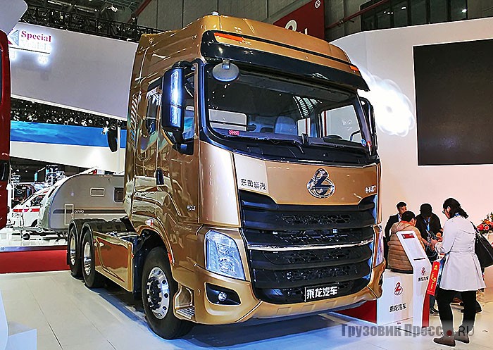 На выставке в Шанхае концерн DFMC показал несколько новинок. Среди них выделялся магистральный седельный тягач Denon с кабиной от среднетоннажного грузовика Dongfeng Kingrun. Кабина, кстати, от него же. Для модели Denon её сильно модифицировали, удлинив спальный отсек и установив высокую крышу.