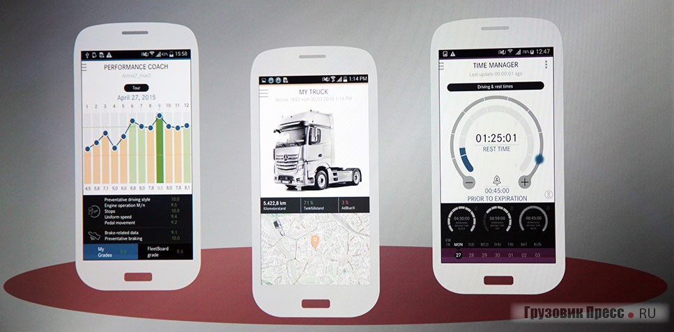 Кроме оригинальной раскраски полуприцепа «самостоятельный» автопоезд, состоящий из тягача Mercedes-Benz Actros с полуприцепом Krone, отличается наличием оранжевых проблесковых маячков на крыше кабины и таблички с надписью «Testfahrt. Abstand halten!» («Тест-драйв, держать дистанцию!») на заднем борту полуприцепа. Водитель по-прежнему никуда не делся и присутствует в кабине. Предложенная ранее футуристическая модель роли водителя, расслабленно наблюдающего за дорогой и одновременно решающего организационные вопросы офисно-делового уровня, за два года отошла на второй план, сменившись более реалистичным сценарием, который теперь выглядит примерно так: шофёр постоянно контролирует автомобиль, и по просьбе электронной системы периодически берёт управление на себя, а при длительном движении по прямой может немного отвлечься, чтобы, к примеру, выпить кофе или вдоволь поговорить по телефону. Зато функции организатора в отличие от модели двухгодичной давности теперь под контролем электронного мозга. Это вопросы удалённой диагностики автомобиля, устранения неисправностей, планирования очередного технического обслуживания и организации логистики грузоперевозок, которые теперь полностью переданы различным, связанным между собой телематическим системам. Ключевое слово, звучавшее на этом форуме, – «связанный в единую сеть транспорт». Идеологи презентованных технологий даже придумали новый термин – «интернет вещей». Как и бывает в реальности, абстрактное будущее постепенно преобразуется в логичные и конкретные модули, которые складываются в завтрашние технологии из сегодняшнего понимания вопроса.