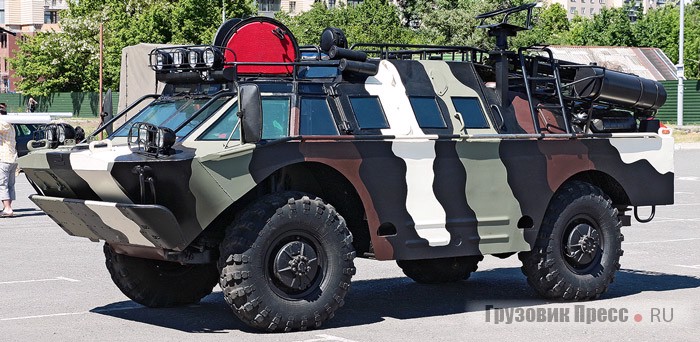 Еще один кемпер на базе БРДМ-2 предназначен специально для охотников и рыболовов. У этой машины салон тоже повышенной комфортности, но есть ряд дополнений по сравнению с «УМКОЙ». Прежде всего – несколько люков на крыше, чтобы могли одновременно стрелять по дичи несколько охотников. На крыше кузова предусмотрена небольшая палуба с невысокими поручнями, с которой также можно вести охоту. Для любителей рыбалки было сконструировано специальное подъемное сиденье, как в 6-колесном чудовище Франко Сбарро 1979 года, сконструированном для одного из эмиров Саудовской Аравии из Mercedes-Benz и Ford Granada (впрочем, Sbarro Adventurre 6х6 не умел плавать). Когда БРДМ-2 находится на воде, рыбак может подняться на несколько метров выше вездехода и забрасывать удочку. Транспортное средство имеет решетчатый багажник для поклажи. Здесь же закреплены сенд-траки для преодоления сыпучих грунтов. На машине изобилие всевозможных осветительных приборов. Для оружия в салоне предусмотрены оружейный шкаф и рундуки для хранения снастей. Лебедка с 50-метровой запасовкой троса с приводом от ВОМ обладает усилием 9 тс.